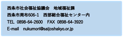 社会福祉法人西条市社会福祉協議会 〒799-1371 愛媛県西条市周布606番地1 Tel 0898-64-2600 Fax 0898-64-3920